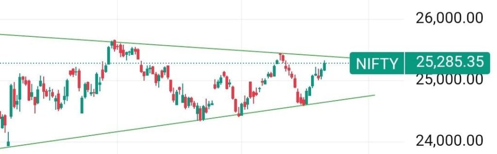 आज Nifty 50 इंडेक्स 25200 के ऊपर बंद हुआ और पिछले तीन कैंडल्स के बाद एक बड़ी हरित कैंडल बनी।