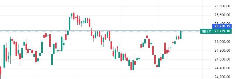 निफ्टी 50 फिर से अपने 25250 के प्रतिरोध स्तर पर है। आज का समापन अच्छा रहा, लेकिन आगे की तेजी के लिए 25250 को पार करना एक महत्वपूर्ण स्तर है।
